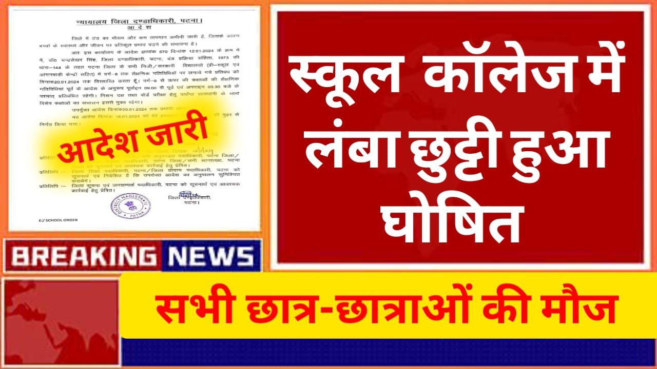 School Holiday : सभी छात्रों के लिए खुशखबरी है! स्कूल और कॉलेज प्रशासन ने अचानक लंबा छुट्टी का ऐलान कर दिया है। यह खबर जैसे ही सामने आई, छात्रों में खुशी की लहर दौड़ गई। लंबे समय से पढ़ाई और परीक्षा की भागदौड़ में व्यस्त छात्र अब थोड़ी राहत महसूस कर सकते हैं और मस्ती भरे पल बिता सकते हैं।